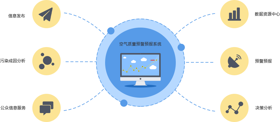 充分运用物联网、大数据和移动互联等先进技术,建立空气质量预报模型,以此实现对环境空气质量数值的预报运算及展示,进而提供环境空气质量数值预报服务的产品。针对部分重污染状况提供预警发布和应急响应,同时应用源解析技术实现区域及城市污染的成因分析,组织开展空气质量预警预报工作,加强环保局大气环境监督管理能力。通过信息化手段整合大气环境信息资源,提供统一的信息采集、管理、分析和发布工具,为大气预警预报工作提供专业的决策支撑,为改善大气环境质量提供有力的技术支持。